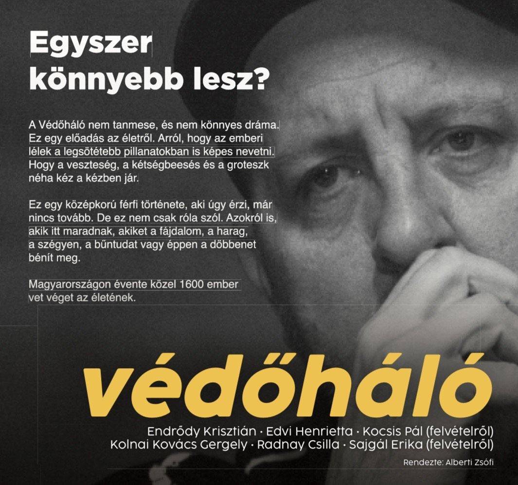 Voltak jelek, amiből észre vehette volna a környezete, mire készül Péter? Meg lehetett volna menteni? Van-e okunk boldogan élni, ha így veszítjük el egy szerettünket? Mi az egyéni felelősségünk? Hogy viszonyul az öngyilkossághoz a társadalom? Ilyen és ehhez hasonló kérdéseket tesz fel a Védőháló című előadás. Közös gondolkodásra, hív, de nem ad választ.