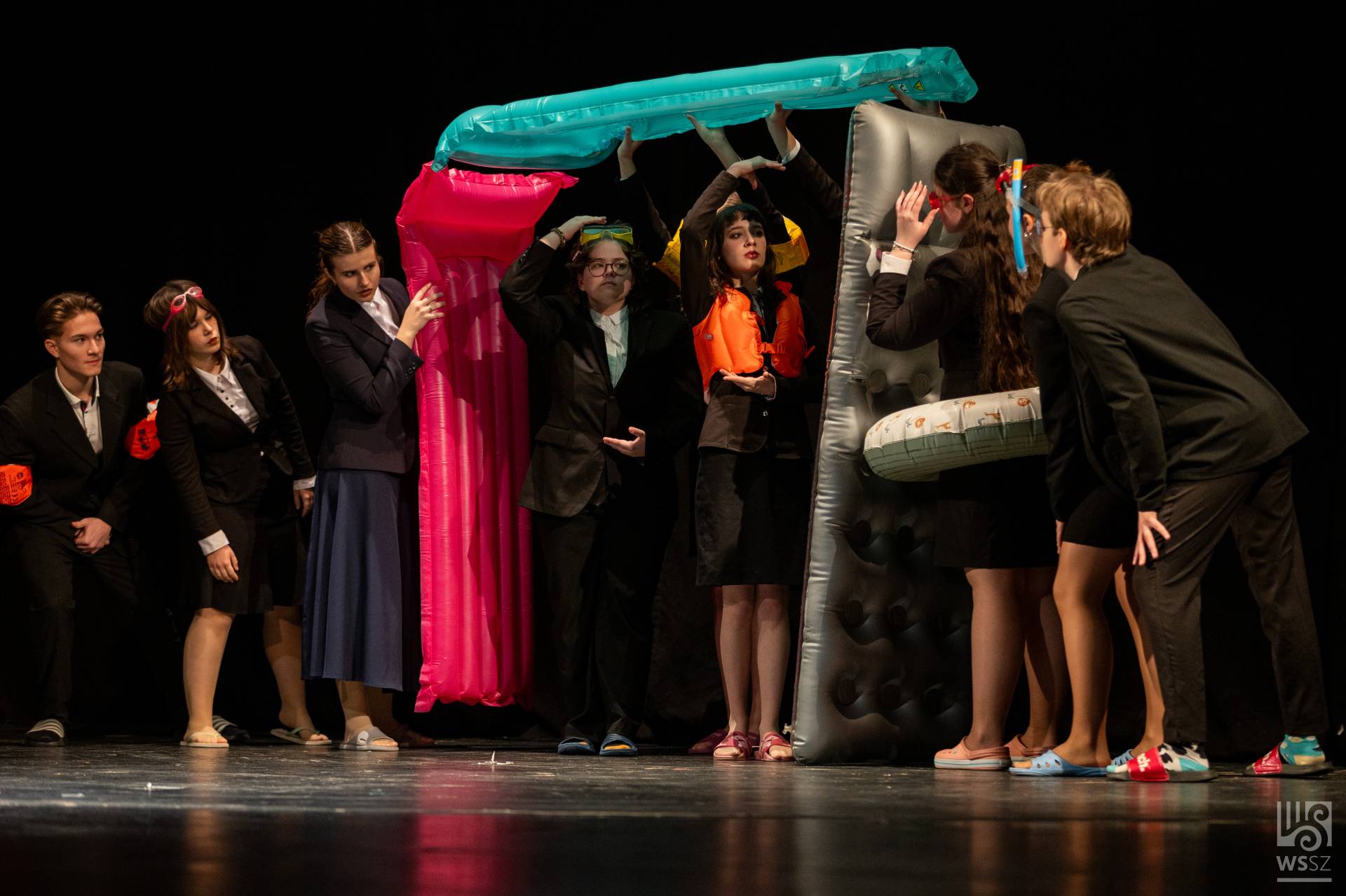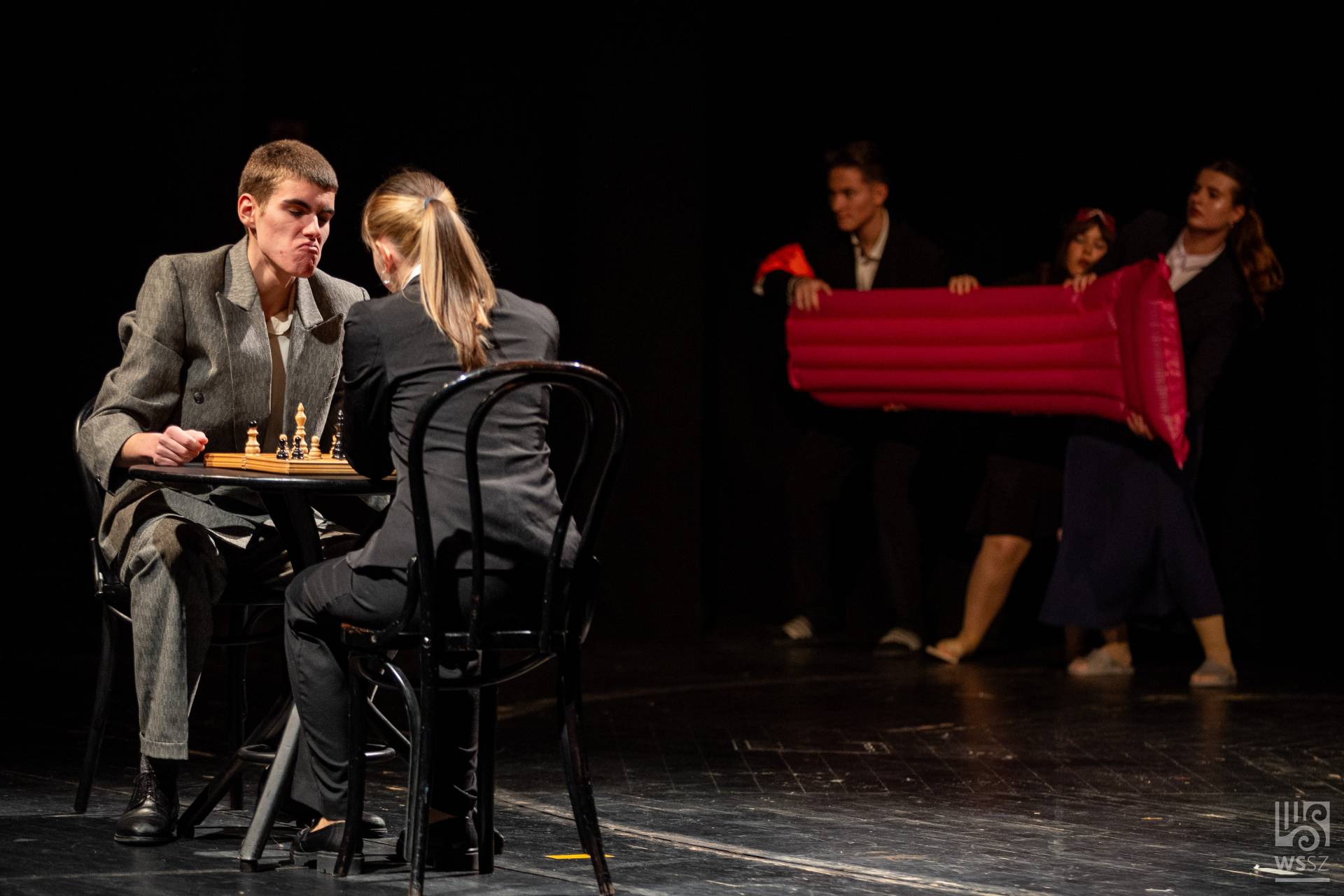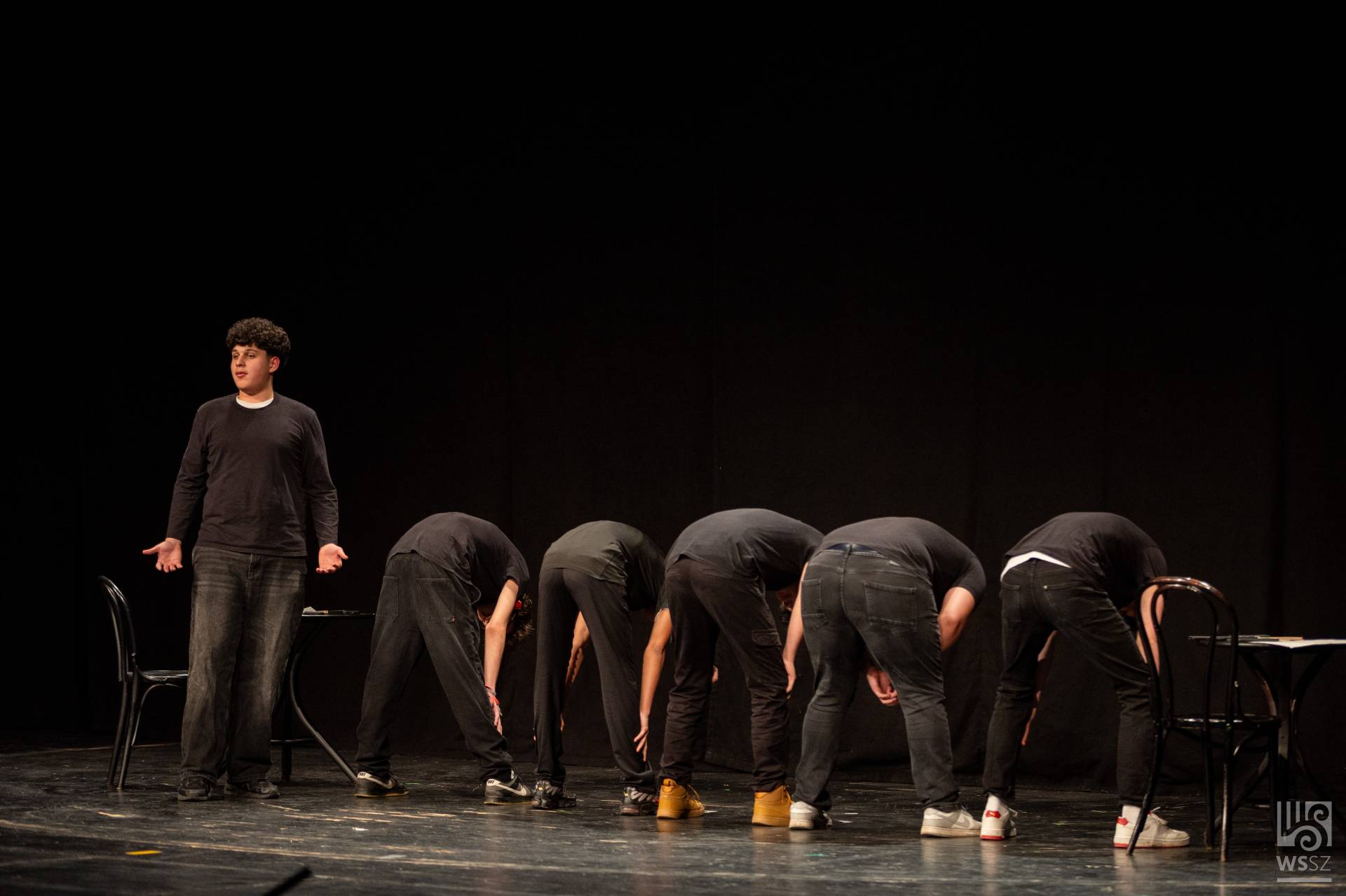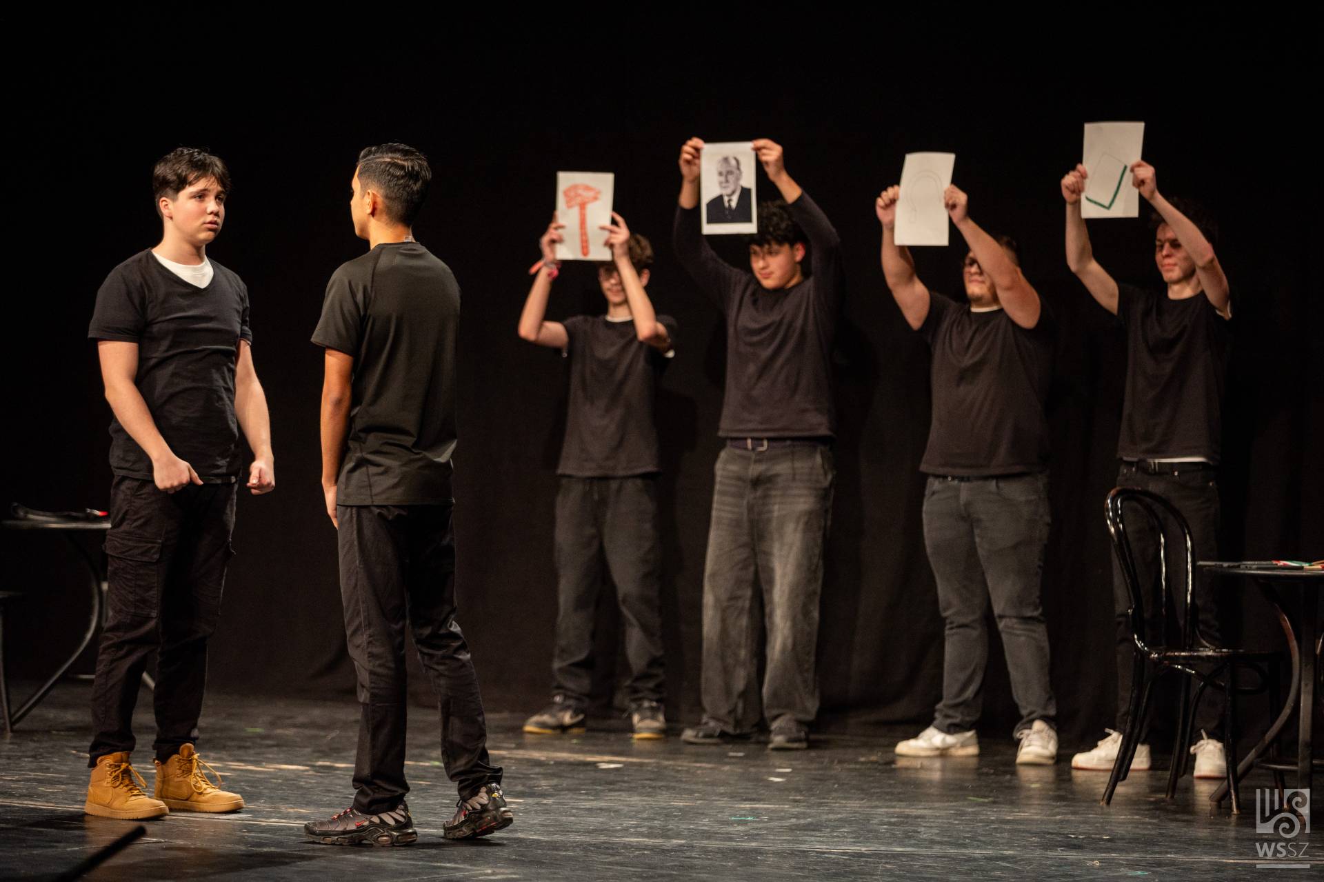 Budapestről érkezett az Újpesti Két Tanítási Nyelvű Műszaki Technikumból a hatfős fiú színjátszó csapat. Mivel színpad nem állt rendelkezésükre, többnyire a technikum könyvtárában gyakoroltak. A jelenetet felkészítő tanáruk, Pusztai Gyula szerkesztette Örkény István és Bödőcs Tibor szövegeinek felhasználásával, valamint egy bölcs vicc segítségével.