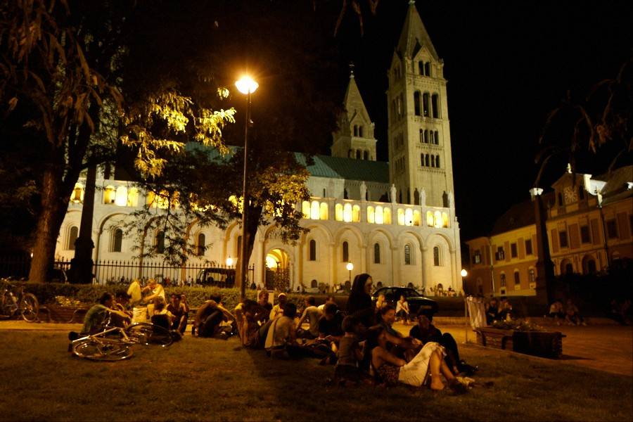 Pécsnek, ezt már érkezésünk pillanatában megállapítottuk, nem kell különösebb pénzeket költeni imázs-építésre: szép, szabadtéri fürdőként is üzemelő csobbanóival és szökőkútjaival, történelmi tereivel és épületegyütteseivel, hangulatos teraszaival. Méltónak ítéltetik arra, hogy az év bármely szakában kulturális centrum legyen. Irigykedünk, hogy hétköznap éjszaka sem áll le az élet: hajnalban a Dóm téren, a bazilika lépcsőjén csapatokba verődve hűsölnek fiatalok, lent a gasztro-soron pedig hétköznap is karneváli a hangulat: sült hallal, héjában főtt krumplival, Villányi borokkal és házipálinka-különlegességekkel fűszerezve…